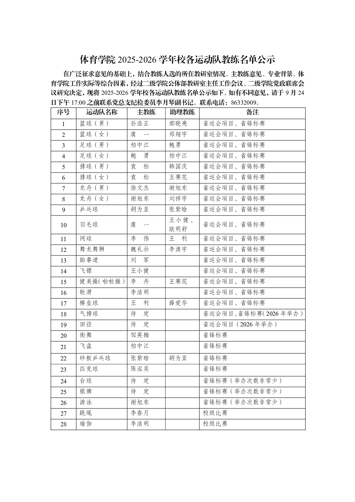 yl1111永利集团 2025-2026 学年校各运动队教练名单公示